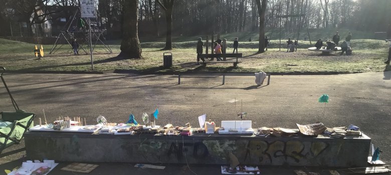 Aujourd'hui, nous sommes allés au parc municipal et nous avons testé si nos radeaux flottaient. Ensuite, nous avons pu jouer dans l'aire de jeux.
