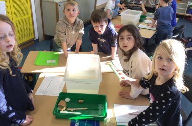 A természettudományos órákon sok különböző anyagból készült tárgyat tartottunk egy doboz vízben, hogy megnézzük, úsznak-e vagy süllyednek. Végül még a fémet is sikerült lebegővé tennünk. Egy alufóliából készült hajó 72 üveggolyót szállított, mielőtt elsüllyedt volna.