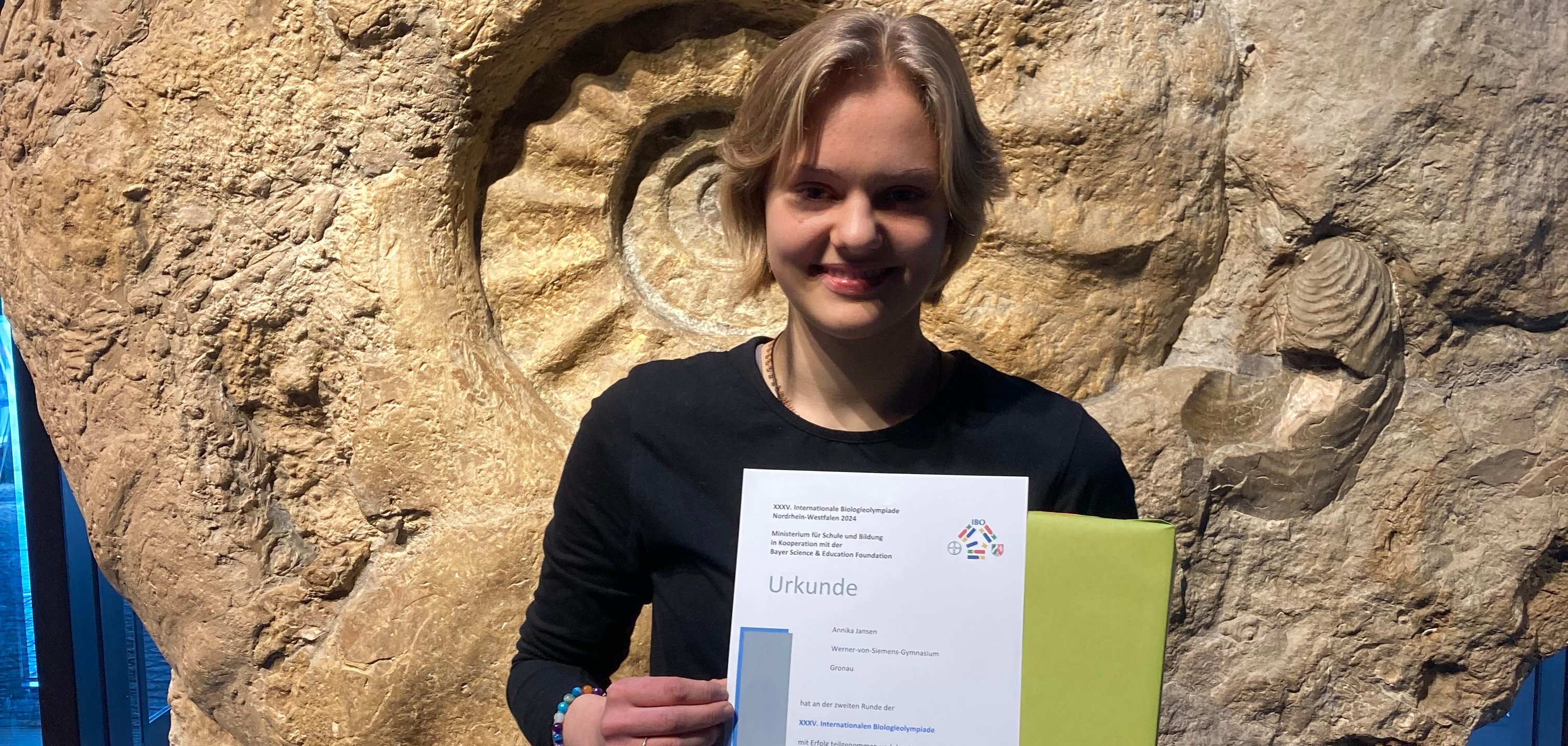 Annika Jansen a Q2-ből sikeresen teljesítette a Nemzetközi Biológia Olimpia második fordulóját, és ezzel az első helyet szerezte meg NRW-ben és a negyedik helyet Németországban.