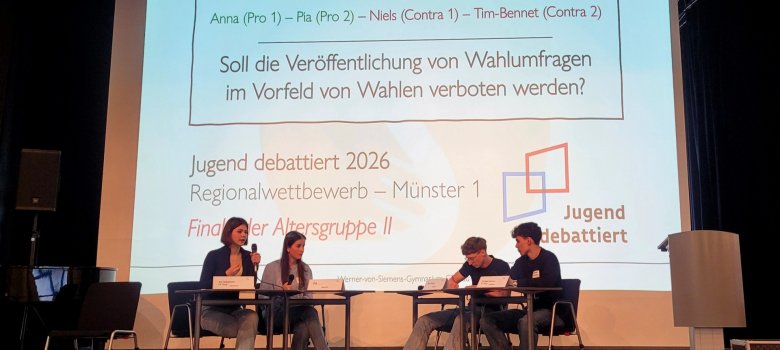 Setelah pembukaan dengan musik dan penyambutan para tamu, yang datang dari enam sekolah di Münster dan wilayah Münsterland, ke-16 peserta debat kelompok usia I (kelas 8 sampai 10) dan 12 peserta debat kelompok usia II (sekolah menengah atas) tampil memukau dalam beberapa babak kualifikasi dengan posisi yang jelas, argumen yang beralasan, serta interaksi yang adil dan saling menghargai satu sama lain.