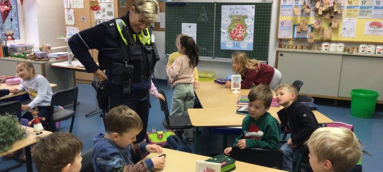 В среду там была женщина-полицейский, и всем детям разрешили задавать вопросы и внимательно рассматривать форму. Затем она прочитала всем детям полицейскую книгу. Все дети получили от капитана Голубева буклет по правилам дорожного движения, а те, кто хотел, могли примерить наручники.