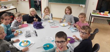 今天,我们弥补了第二节课取消的游览活动:我们步行前往 Meyer 家的土豆田。到了那里,我们首先了解了许多关于马铃薯的知识以及它们是如何生长的。我们还在土壤中发现了许多不同的品种。然后,我们被允许近距离观察大型收割机,甚至有一次还爬上了收割机。我们每个人都收获了满满一袋土豆。明天,我们将烹饪美味的夹心土豆,配上苹果酱和香草蘸酱享用。