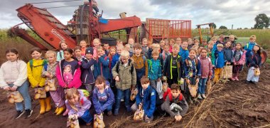 今天,我们弥补了第二节课取消的游览活动:我们步行前往 Meyer 家的土豆田。到了那里,我们首先了解了许多关于马铃薯的知识以及它们是如何生长的。我们还在土壤中发现了许多不同的品种。然后,我们被允许近距离观察大型收割机,甚至有一次还爬上了收割机。我们每个人都收获了满满一袋土豆。明天,我们将烹饪美味的夹心土豆,配上苹果酱和香草蘸酱享用。